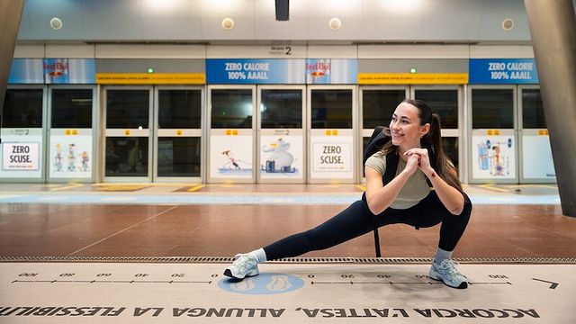 Ma non si tratta solo di impatto visivo, nel corridoio di accesso prima dei tornelli, i passeggeri troveranno una grafica a pavimento interattiva con esercizi suggeriti: squat, jumping jack, calci all’indietro, alzate sulle punte, affondi, tocco delle punte e persino una proposta di stretching dinamico. Un vero e proprio “warm-up urbano” che accompagna il passaggio quotidiano con energia.