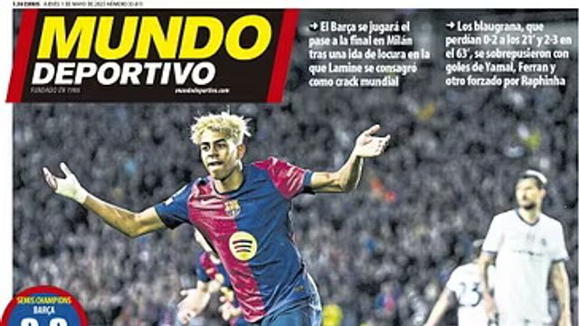 "Con Lamine tutto è possibile". La Spagna celebra Yamal, il 'fenomeno' del Barcellona che a 17 anni ha guidato i blaugrana nella rimonta-show contro l'Inter: nella semifinale di andata di Champions, il giocatore classe 2007 ha "impressionato il mondo" scrive Sport. L'altro quotidiano AS titola 'Meraviglioso, le magie di Lamine nella sua partita n.100 in blaugrana', parlando del fuoriclasse minorenne, per il quale sono tornati copiosi i paragoni con Leo Messi. "E' l'erede naturale di Messi" sottolinea AS, che definisce la partita di ieri sera (finita 3-3) "un inno al calcio". Anche Marca parla del match come di 'un festival' e Mundo Deportivo ancora su Yamal 'Mamma mia'.