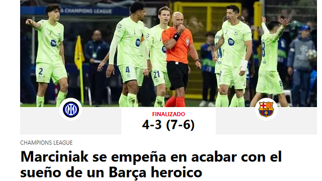 Sport, quotidiano spagnolo vicino alle cose del Barcellona, mastica amaro dopo la sconfitta nella semifinale di Champions League contro l'Inter e se la prende con l'arbitro: "Marciniak mette fine al sogno di un Barcellona eroico" si vede sul sito. E ancora: "Una pessima prestazione dell'arbitro polacco e un'Inter epica hanno lasciato la squadra di Flick senza finae".