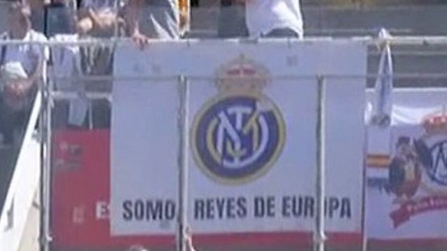 "Siamo i re d'Europa" si legge su uno striscione esposto dai tifosi del Real Madrid a Barcellona, dove si gioca un Clasico molto importante per la Liga. Sullo striscione, che mira a prendere in giro i rivali di sempre, compare anche un mash-up tra il logo dei Blancos e quello dell'Inter, che ha eliminato i blaugrana dalla Champions League in semifinale.