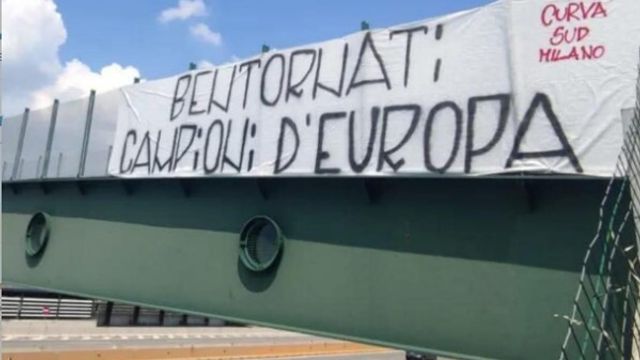 Sull'autostrada all'ingresso per Milano è comparso questa mattina un ironico striscione firmato Curva Sud Milano che "accoglie" i giocatori dell'Inter di ritorno dalla finale di Champions giocata a Monaco e persa nettamente contro il Psg: "Bentornati campioni d'Europa". Anche fuori da San Siro sono apparsi striscioni dei tifosi del Milan contro i cugini nerazzurri: "Ieri Istanbul, oggi Monaco, domani tutti dallo psicologo", è scritto in uno. Più semplice l'altro: "Zero tituli".
