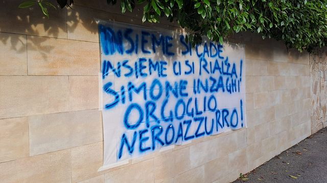 "Insieme si cade, insieme ci si rialza. Simone Inzaghi, orgoglio nerazzurro". Questa la scritta che è apparsa su un grande striscione appeso sulla recinzione della casa piacentina di Simone (e Pippo) Inzaghi, dove abitano i genitori, Giancarlo e Marina, nel loro paese natale.