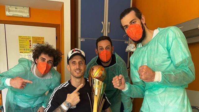 A portarglielo, tutto il gruppo di coach Ivanovic. A consegnarglielo personalmente, 3 degli uomini più legati personalmente ad Achi, saliti nella camera dell'Ospedale Sant'Orsola Malpighi: Alessandro Pajola, concittadino e compagni di tante estati con Italbasket; Marco Belinelli, capitano e amico di lunga data; Tornik'e Shengelia, compagno dell'altro campionato nazionale vinto in precedenza da Polonara (Baskonia 2020).