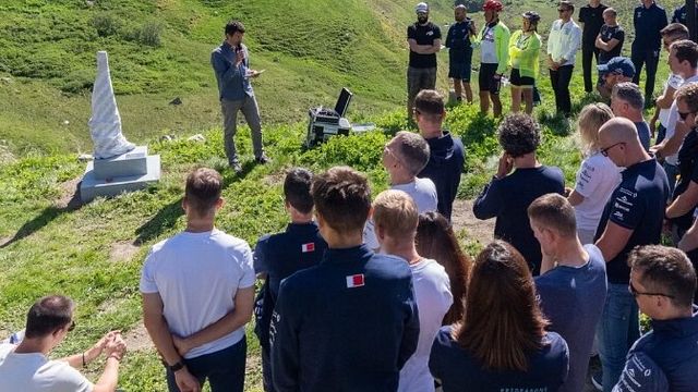 Prima del via della quinta tappa del Giro di Svizzera, a La Punt è stato inaugurato un monumento in memoria di Gino Mäder, il giovane corridore svizzero morto dopo una drammatica caduta sul Passo dell’Albula nel 2023. La scultura – realizzata dallo zio di Mäder, Gügi Eugster – è stata posizionata proprio nella curva fatale. Ogni squadra in gara ha deposto una pietra o una maglietta ai piedi del monumento, gesto che ha reso il momento ancora più solenne.