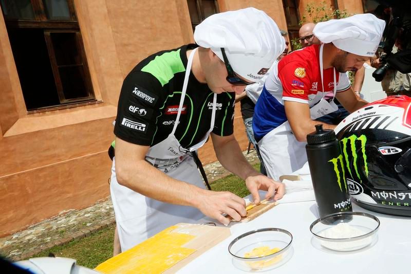 Alcuni tra i protagonisti del Mondiale Superbike sono stati impegnati in una sfida culinaria a Imola. Il capo classifica Jonathan Rea e i rivali Jordi Torres, Sylvain Guintoli, Leron Camier, Davide Giugliano, ai quali si è unito Michel Fabrizio, sostituto di Nico Terol, si sono dati battaglia nella produzione di pasta fresca, seguiti dal famoso chef Valentino Marcattilii e dal suo gruppo di cuochi. Ha fatto da cornice all’evento il museo San Domenico, situato al lato dell’omonimo ristorante che prepara piatti di alta qualità dal 1970. Dopo una breve dimostrazione di come creare il piatto da parte di Marcattilii stesso, i piloti sono stati giudicati da una giuria composta da personalità conosciute del paddock. La nostra Anna Capella, Stefano Saragoni, Ernesto Marinelli e Federico Poggipollini, hanno decretato Michel Fabrizio vincitore dopo avergli un punteggio di 18 punti su un massimo di 20. Il pilota italiano, che ha battuto di pochissimo Leon Camier, ha ricevuto come premio un piccolo trofeo a simboleggiare sia il Mondiale Superbike che la cucina, due passioni tipicamente italiane. Fabrizio ha commentato; “È una buon modo di iniziare il fine settimana, ma ovviamente sono concentrato sulle gare, visto che potrebbero essere le ultime dell’anno per me”.