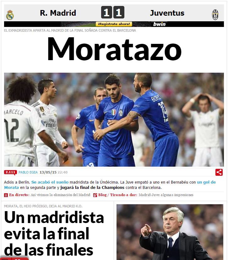 In Spagna i siti online dei principali quotidiani sportivi hanno dato ampio spazio alla sconfitta del Real Madrid per mano della Juve. Su tutti, il titolo di "Marca", che con il suo "Moratazo" rende bene l'idea, facendo riferimento alla rete decisiva dell'ex Blancos.