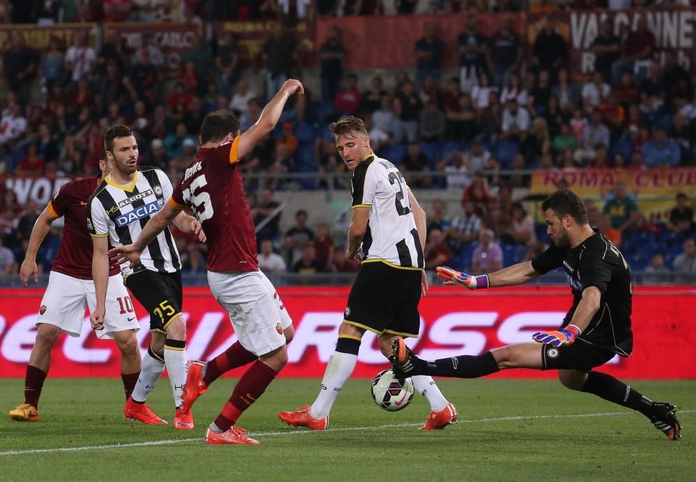 Nel primo posticipo della 36a giornata di Serie A, la Roma batte 2-1 l'Udinese ed effettua il contro-sorpasso ai danni della Lazio: al derby i giallorossi si presentano come secondi e con un punto di vantaggio sui cugini. All'Olimpico passano prima i friulani, con il primo gol in Serie A di Perica (19'). Il pareggio giallorosso al 45' con Nainggolan. Al 20' st il gol-vittoria di Torosidis. Traverse di Guilherme e Holebas, palo di Nainggolan.