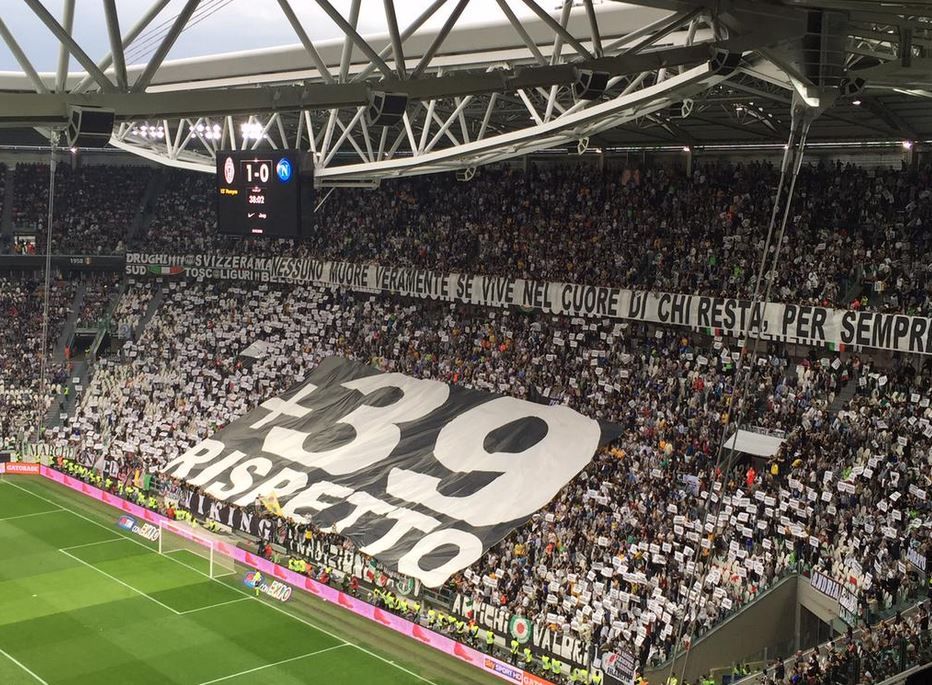 "Nessuno muore veramente se vive nel cuore di chi resta per sempre: +39, rispetto". Con questo messaggio, esposto al 39', lo Juventus Stadium ha ricordato le 39 vittime della strage dell'Heysel, di cui il 29 maggio ricorre il trentennale. Attorno all'enorme striscione, i tifosi hanno esposto cartelli con i nomi delle vittime, travolte dalla furia degli hooligan inglesi sugli spalti dello stadio di Bruxelles, sede della finale di Coppa Campioni 1984/85 tra Juve e Liverpool. Tutto il pubblico ha applaudito in piedi.