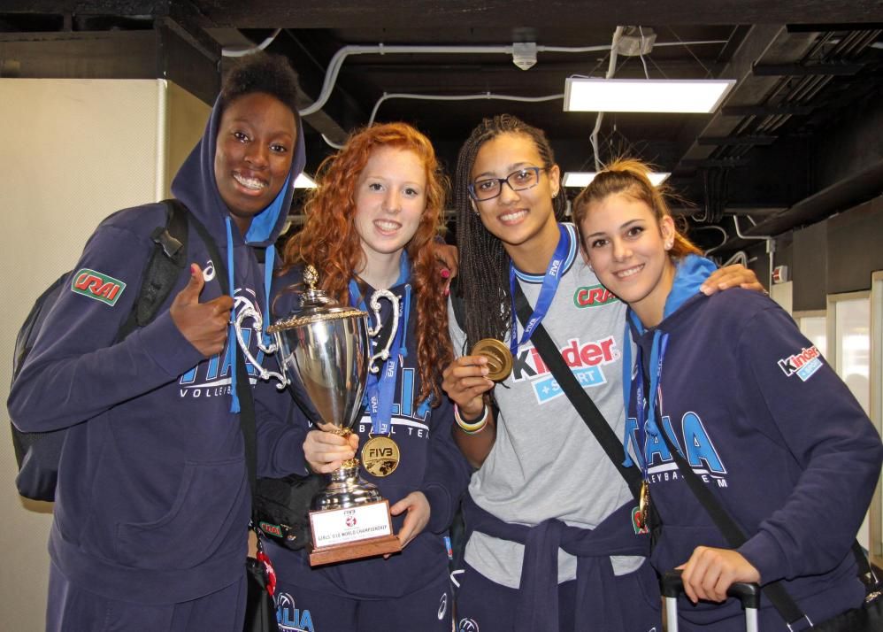 Al grido di "Brave, brave!", che tanti passeggeri hanno voluto indirizzare nei loro confronti, sono rientrate in Italia le campionesse del mondo di volley under 18, reduci dal trionfo in Perù. Le azzurre, guidate da Marco Mencarelli, sono sbarcate poco dopo le 11 all'aeroporto di Fiumicino con un volo Iberia via Madrid. Con la medaglia iridata al collo, le ragazze, nel tragitto dall'uscita dall'aereo fino alla sala bagagli, sono state salutate calorosamente da tanti viaggiatori che hanno voluto così congratularsi per il successo iridato. "Poco fa - ha detto Mencarelli - ho sentito al telefono il presidente del Coni Malagò che si è personalmente congratulato con tutte le ragazze per questo successo".