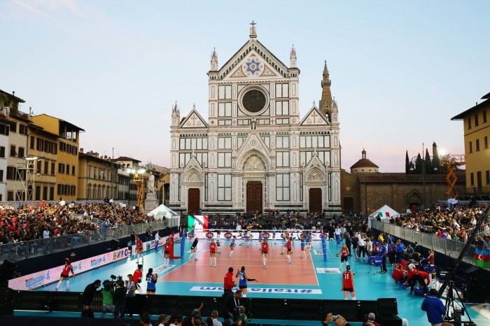 Le Azzurre del volley si sono esibite nella suggestiva piazza Santa Croce a Firenze, dove solitamente si gioca il calcio storico. Davanti a oltre duemila persone, l'Italia di Bonitta ha superato per 3-0 l'Azerbaijan in vista degli Europei di fine mese.