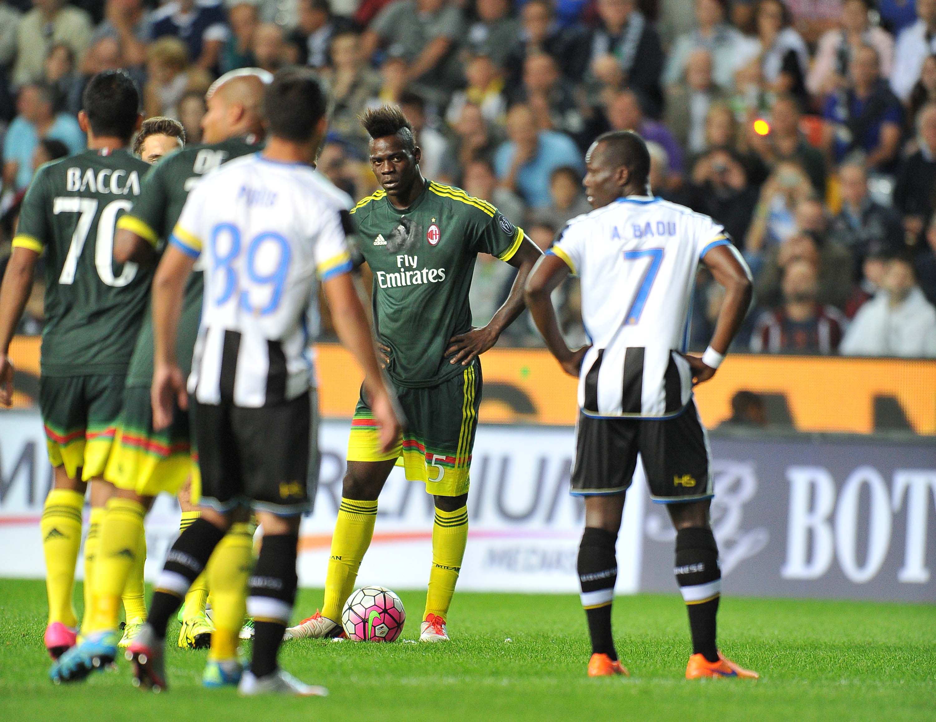 Nell'anticipo della 5a giornata di Serie A, il Milan batte 3-2 al Friuli l'Udinese e sale a 9 punti in classifica. Primo tempo perfetto dei rossoneri, che vanno al riposo sul 3-0. Al 5' apre Balotelli, alla prima da titolare, su punizione, al 10' raddoppia Bonaventura e nel recupero arriva anche la zuccata dell'ex Zapata. Nella ripresa Colantuono mette dentro Duvan Zapata che gira il match con l'assist a Badu (6') e il gol del 2-3 (13').