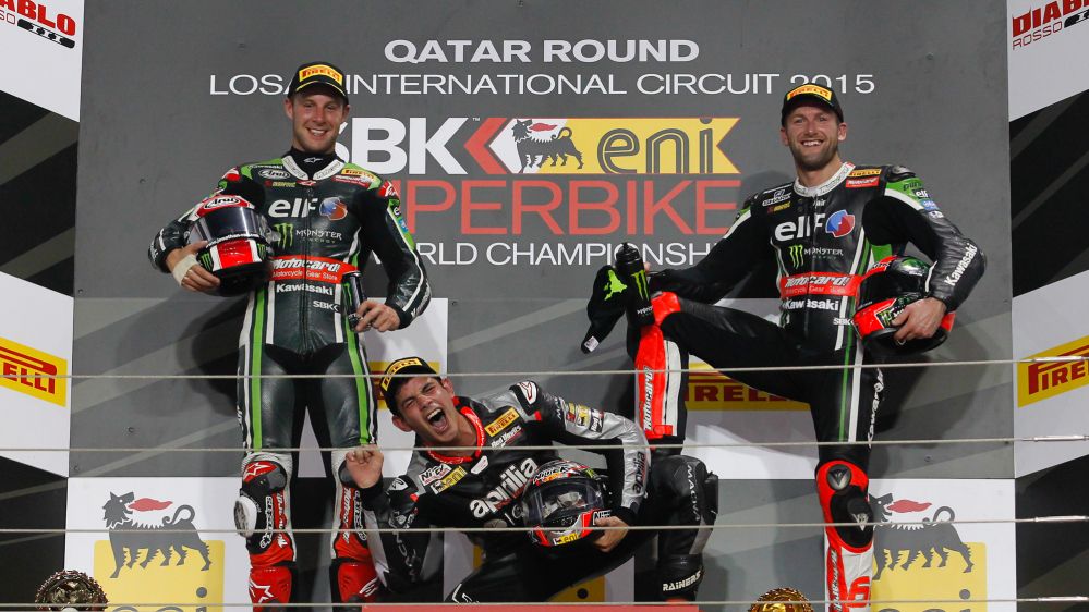 Jordi Torres conquista uno storico successo in gara 1 a Losail, al termine di una grande battaglia con il Campione del Mondo Superbike 2015, Jonathan Rea. I due hanno dato spettacolo in pista, andando oltre il limite, con sorpassi e controsorpassi. All'ultima curva Rea ha provato l'ingresso all'esterno del rivale, un sorpasso impossibile, che lo ha costretto largo. Torres ha tenuto la linea firmando il primo successo dalla gara Moto2 del 2013 al Sachsenring. Il pilota originario di Rubì, Catalunya, interrompe così la striscia di successi britannici in SBK, che durava da inizio stagione. In gara2 tocca ad Haslam salire sul gradino più alto, regalando sempre all'Aprilia il successo. Una doppietta importante per il made in Italy, che chiude una stagione dominata dalla Kawasaki.