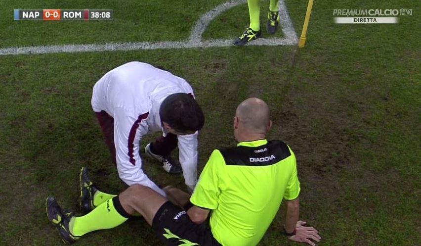 Infortunio a uno dei collaboratori dell'arbitro Rizzoli in Napoli-Roma. Al 39' il guardalinee Cariolato si è accasciato subito dopo aver seguito un'azione conclusasi con un cross di Ghoulam sul quale Higuain non era arrivato per un soffio. Cariolato è andato a terra e non ce l'ha fatta a riprendersi, nonostante sia subito accorso, per aiutarlo, lo staff sanitario della Roma. A sostituirlo ha provveduto il quarto uomo Barbirati. Cariolato, in lacrime, è stato portato fuori con la barella mobile.