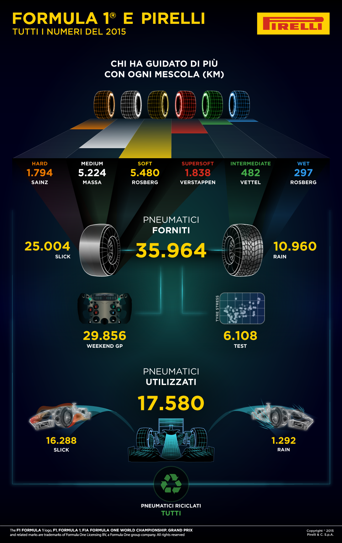 La Pirelli ha dato i numeri della stagione 2015 di Formula 1 e il direttore del Motorsport, Paul Hembery, ha fatto il bilancio. “Mentre ci prepariamo alla nostra sesta stagione consecutiva in Formula Uno, pubblichiamo come da tradizione tutte le statistiche relative alla nostra stagione 2015, appena conclusa. È stato un anno all’insegna dell’evoluzione, con i team costantemente impegnati nelllo sviluppo tecnico delle monoposto, introdotte a inizio 2014 per il nuovo regolamento con motore turbo ibrido. Come sempre, la curva dello sviluppo tecnico ha accelerato nell’ultima parte del campionato, spremendo al massimo le vetture e mettendo a dura prova gli pneumatici. Abbiamo raggiunto l’obiettivo di 1-2 pit-stop a gara, in un campionato in cui l’interesse sportivo è stato spesso assicurato dalle diverse strategie motivate dalle gomme. Nel 2016 avremo un nuovo regolamento relativo agli pneumatici e porteremo in pista una nuova mescola ultrasoft. Ma ora concentriamoci sui numeri dell’anno appena concluso…”, ha detto.