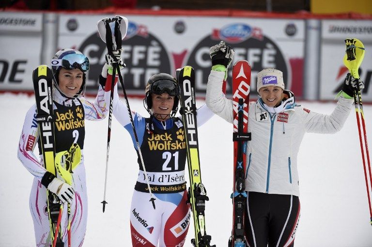 Dopo essersi sfidate in pista per la combinata di Coppa del Mondo, a Val d'Isere Lindsay Vonn e Michaela Kirchgasser si sono date battaglia a colpi di champagne durante la premiazione. Con lara Gut, la vincitrice, a godersi lo spettacolo.