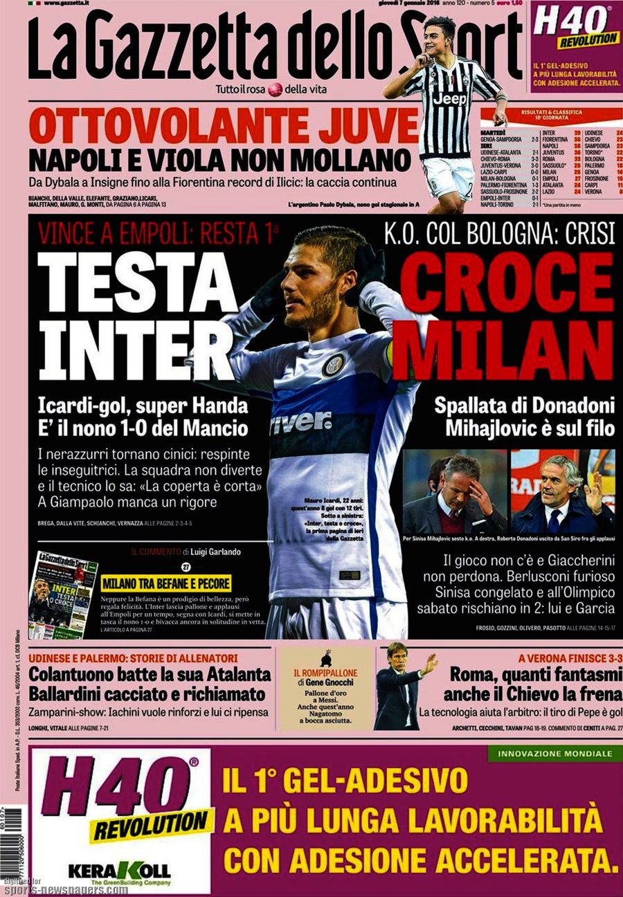 Ecco le prime pagine e gli approfondimenti sportivi dei principali quotidiani italiani e stranieri in edicola oggi, giovedì 7 gennaio 2016.