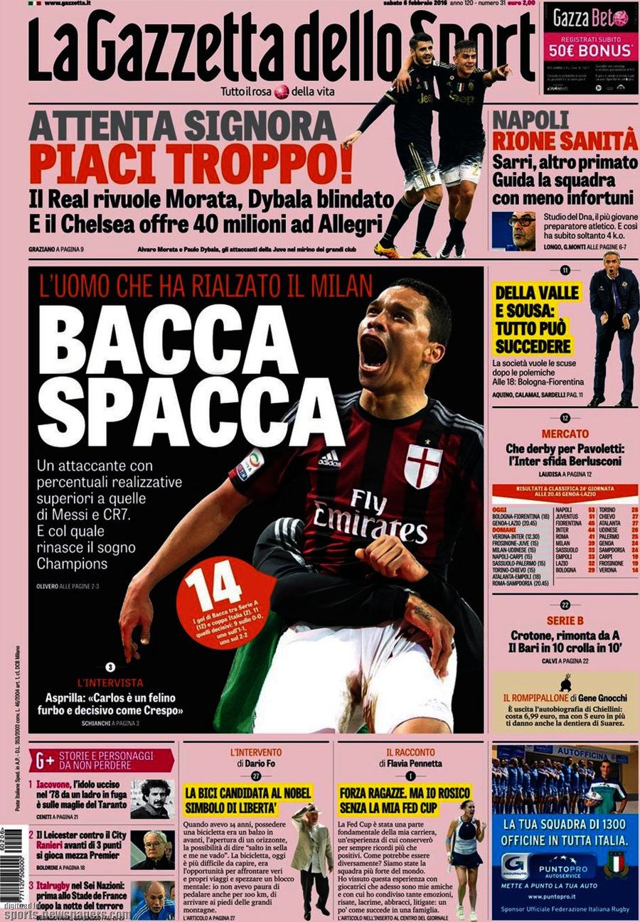 Ecco le prime pagine e gli approfondimenti sportivi dei principali quotidiani italiani e stranieri in edicola oggi, sabato 6 febbraio 2016.