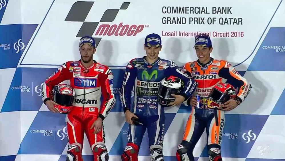 Alla prima gara stagionale di MotoGP in Qatar, Lorenzo riesce a staccare tutti i rivali portando a casa il bottino pieno. Alle spalle un grande Dovizioso su una grande Ducati, peccato per il compagno di squadra Iannone caduto nei primi giri. Il terzo gradino se lo aggiudica Marquez, quarto Rossi che non riesce neanche a tentare un attacco per salire sul podio.