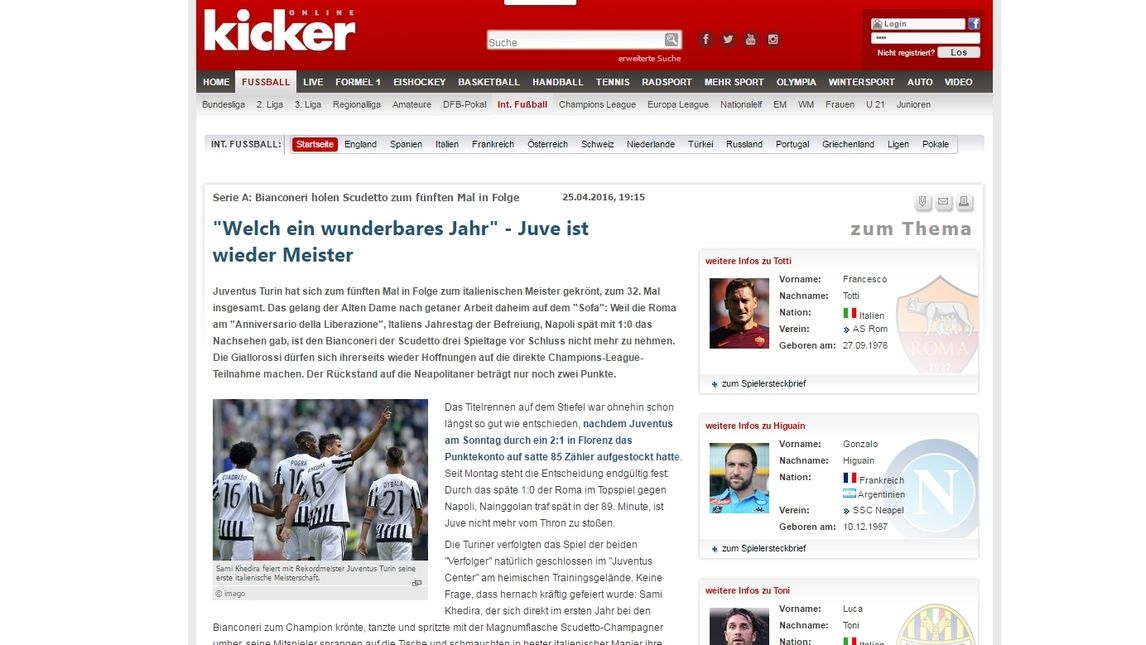 Il quinto scudetto di fila della Juve ha varcato i confini nazionali e anche la stampa straniera esalta l'impresa della squadra di Allegri. Per il "Mundo Deportivo" la vittoria della Juve è una "remontada extraordinaria", per "As" è un "trionfo storico", mentre "Marca" celebra "l'era juventina", ricordando il distacco abissale sul Napoli. Oltremanica, invece, il Guardian incorona la "regina della Serie A", riportando il cammino straordinario della Vecchia Signora.