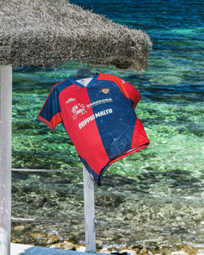 Per presentare l’Home Kit 25/26 sono stati scelti due luoghi di mare simbolo del Sud Sardegna: Punta Molentis, all’interno dell’Area Marina Protetta di Capo Carbonara a Villasimius – con la collaborazione dello stabilimento “I Due Mari” – e il tratto di mare adiacente Cala Fighera, a Cagliari. Il tradizionale rosso e blu a quarti è attraversato da una trama grafica sublimatica nel quarto blu, ispirata ai riflessi mutevoli del mare sardo, come un flusso che annulla le distanze e unisce l’Isola al resto del mondo. Realizzata in tessuto tecnico con fibre di poliestere Dimple e spandex, la maglia integra inserti in Round Mesh e Light Mesh da filato Repreve® di origine riciclata, per unire prestazione e sostenibilità.