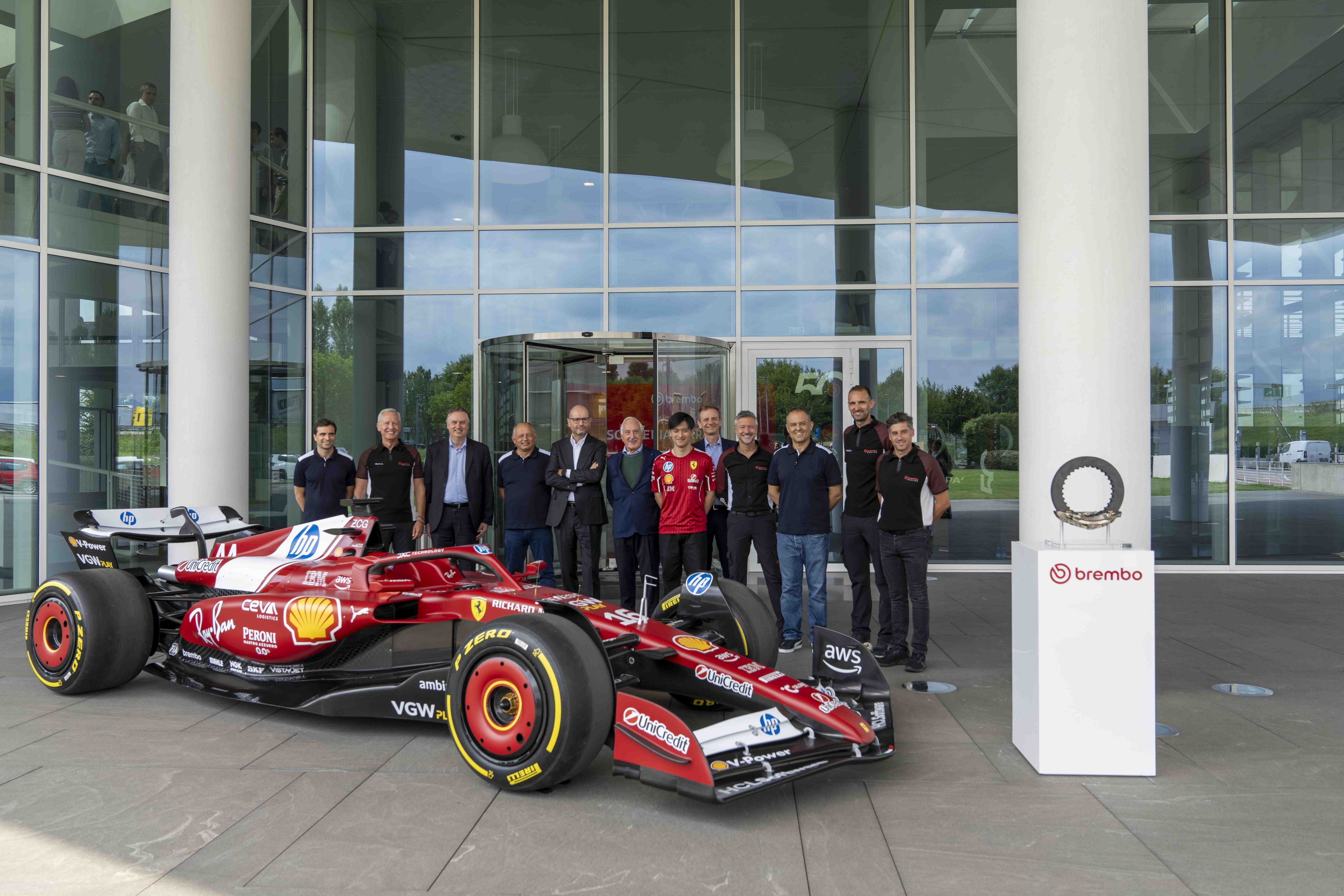 Il Team Scuderia Ferrari HP, rappresentato da Frédéric Vasseur - Team Principal, Jerome D’Ambrosio - Deputy Team Principal, Diego Ioverno - Direttore Sportivo e da Zhou Guanyu - Pilota di riserva è stato accolto dal Top Management di Brembo, più precisamente da Matteo Tiraboschi, Presidente Esecutivo – Alberto Bombassei, Presidente Emerito – Daniele Schillaci, Amministratore Delegato - Mario Almondo, COO Brembo Performance – Mauro Piccoli, CMO Brembo e Luca Di Leo, CCO Brembo.