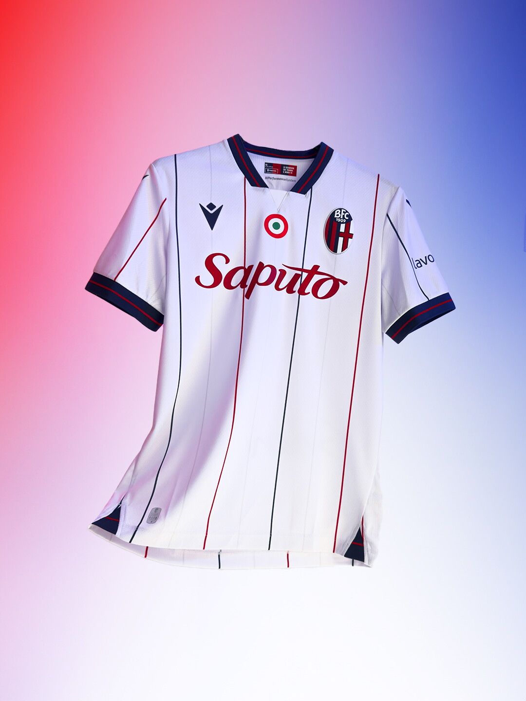 Il kit da trasferta ha un design che crea un senso di continuità con quello casalingo, utilizzando il motivo a righe sottili. Eleganti linee verticali, alternate in rosso, blu e platino, risaltano su un raffinato sfondo bianco. A dominare la scena al centro della maglia è la coccarda riservata alla squadra vincitrice della Coppa Italia, affiancata dal Macron Hero in blu sulla destra e dalla patch con lo stemma del club sulla sinistra. Il design è completato da un collo a V e da maniche che riprendono il motivo delle righe sottili – rossa a destra e blu a sinistra – con eleganti bordi rossoblù.