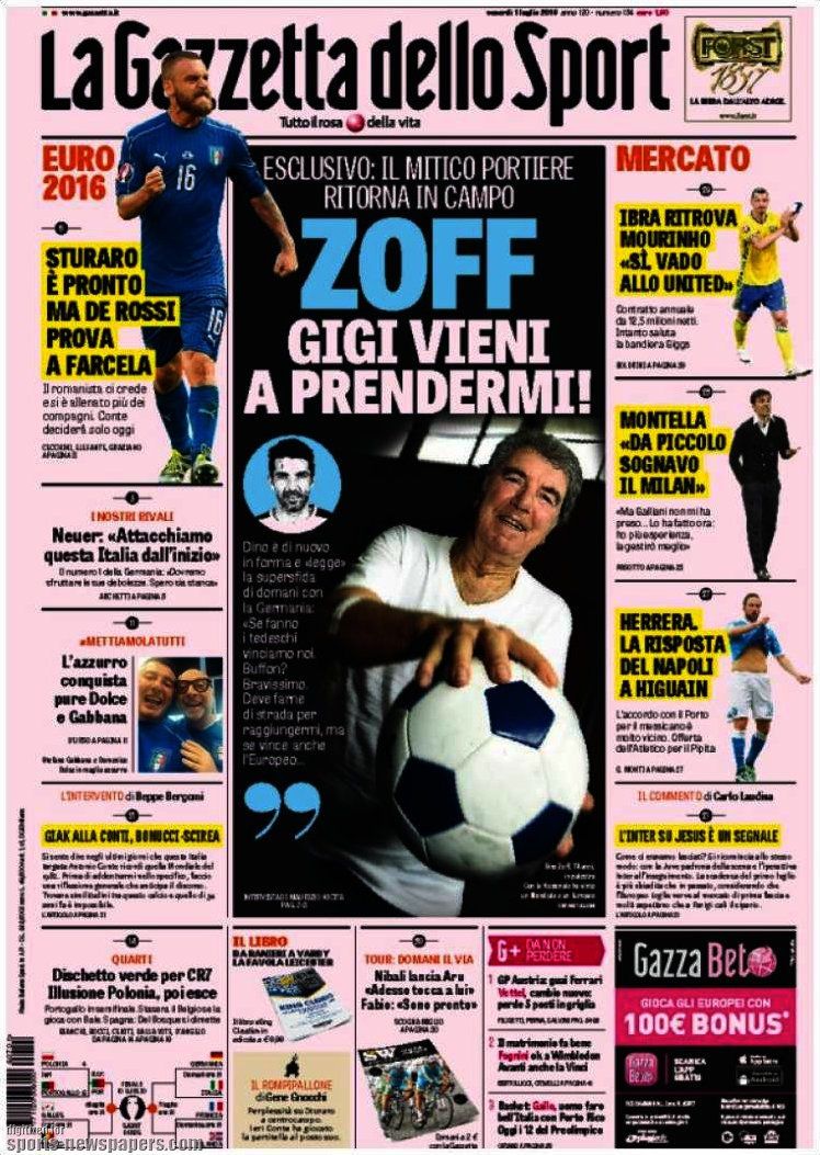 Ecco le prime pagine e gli approfondimenti sportivi dei principali quotidiani italiani e stranieri in edicola oggi, venerdì 1 luglio 2016.