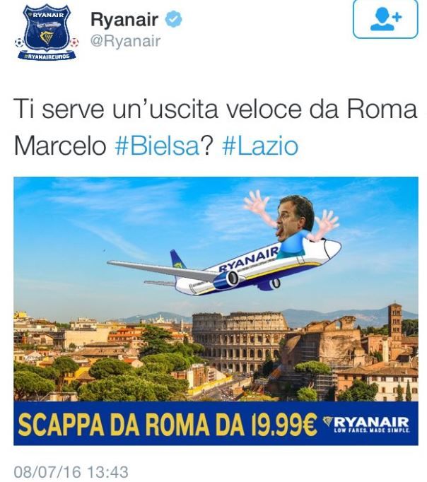 Il clamoroso dietrofront di Bielsa non è passato inosservato sui social network. Online sono infatti spuntati sfottò e fotomontaggi sull'addio de "El Loco" alla Lazio. Anche Ryanair ha partecipato al gioco, pubblicando un tweett tutto da ridere: "#Bielsa, ti serve un'uscita veloce da Roma?".