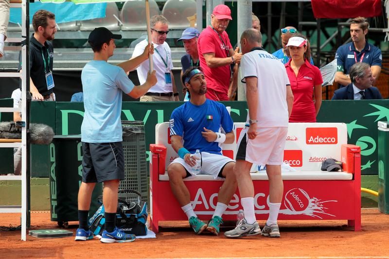 A Pesaro il cuore non basta alla coppia azzurra composta da Fabio Fognini e Paolo Lorenzi, sconfitta 3-2 (6-1, 7-6, 3-6, 3-6, 6-4) da Pella e Del Potro in una maratona di 3 ore e 50 minuti. Con questo successo l'Argentina si porta in vantaggio per 2-1 sull'Italia nei quarti di finale del World Group di Coppa Davis. Nella mattinata Fognini aveva conquistato il primo punto per gli azzurri battendo in tre set (6-1, 6-1, 7-5) Monaco.
