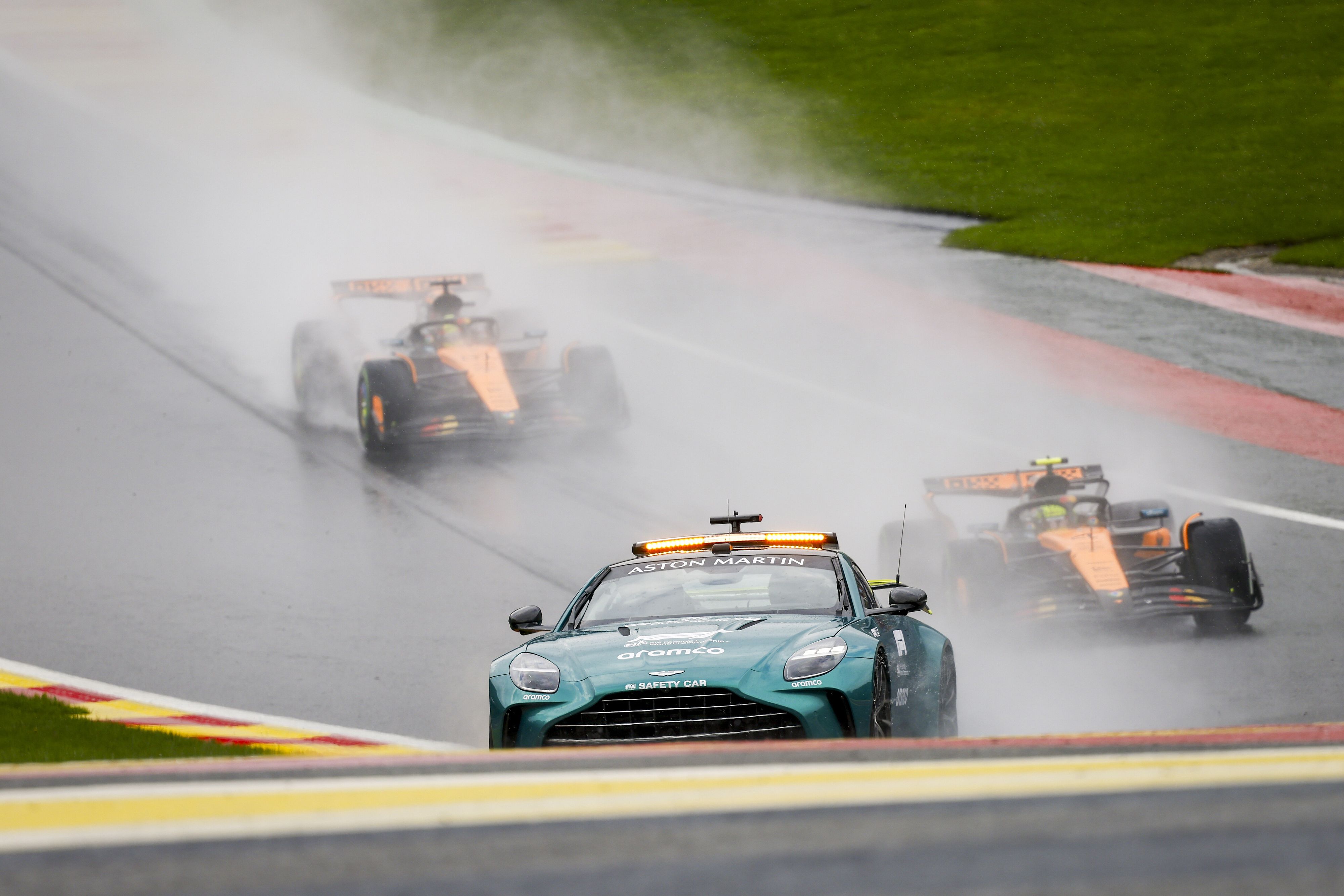 Dopo il lungo stop la gara ha preso il via alle ore 16,20. Il Gp del Belgio ha preso il via con le macchine posizionate dietro la Safety Car che ha cercato di asciugare la pista nel corso dei numerosi passaggi. Dopo quattro tornate, la Safety car è rientrata ai box e la gara vera e propria è cominciata senza partenza dalla griglia, con Lando Norris scattato davanti a Oscar Piastri, che però lo ha superato quasi subito andando in testa.