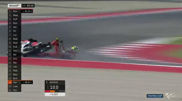 E' iniziato nel peggiore dei modi il weekend di Misano per Andrea Iannone. Il pilota della Ducati, infatti, è caduto rovinosamente dopo pochi minuti della prima sessione di prove libere della MotoGP sul circuito "Marco Simoncelli". Iannone si è rialzato da solo, ma a fatica, e poi è stato trasportato all'ospedale di Cesena a bordo di un elicottero per dei controlli.