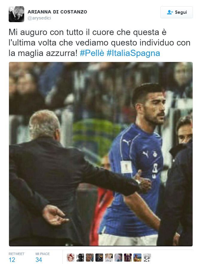 Non è proprio piaciuto ai tifosi il gesto di Pellé, che ha rifiutato la stretta di mano a Ventura dopo la sostituzione in Italia-Spagna. Sul web esplode la rabbia e l'ironia con sfottò e tanti sostenitori della maglia azzurra che hanno pesantemente criticato l'attaccante, chiedendo a Ventura di escluderlo dalle prossime convocazioni. In molti non hanno digerito soprattutto il fatto che questo nuovo scivolone arrivi a pochi mesi di distanza dal cucchiaio contro la Germania a Euro 2016. I tifosi possono perdonare, ma non dimenticano.
