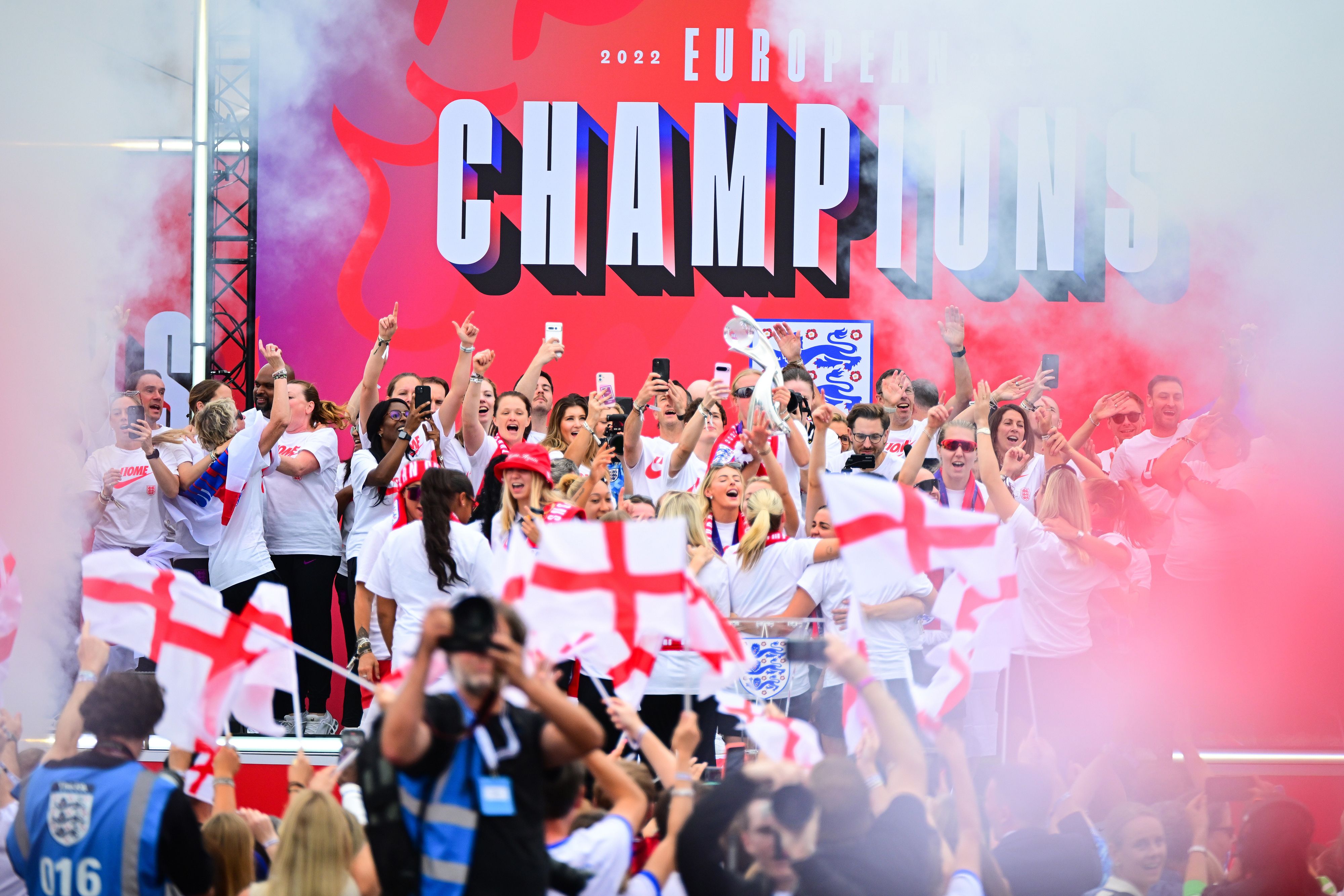 Decine di migliaia di persone hanno partecipato a Londra ai festeggiamenti della nazionale femminile inglese, che domenica si è confermata campionessa d'Europa: due imponenti ali di folla hanno scortato il bus scoperto delle Leonesse, che a passo d'uomo hanno raggiunto Buckingham Palace attraverso l'imponente viale The Mall, stracolmo di tifosi. In un tripudio di fumogeni, canti e bandiere di San Giorgio, le ragazze del calcio inglese sono state portate in trionfo da tantissimi appassionati, in un numero tale che mai si era visto in occasioni di imprese sportive al femminile.