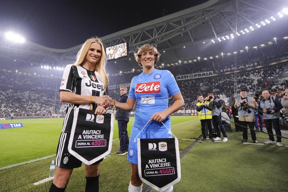 Michelle Hunziker in completo bianconero, Giulia Bongiorno con la divisa del Napoli. Juve e Napoli sono state accompagnate proprio dalla Hunziker e dalla Bongiorno sul terreno di gioco dello Juventus Stadium. Il messaggio, forte e chiaro: "Stop al Femminicidio". La campagna di sensibilizzazione "La tua vita non è un gioco" scenderà in campo in tutti gli stadi della Serie A.