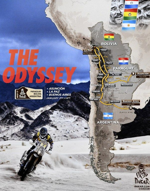 E' stato presentato il percorso dell'edizione 2017 della Dakar. Il rally-raid, che è stato annunciato dagli organizzatori come "il più duro di sempre in Sudamerica", si svolgerà dal 2 al 14 gennaio tra Paraguay, Bolivia e Argentina per un totale di 9.000 chilometri. La partenza è prevista da Asuncion, con arrivo a Buenos Aires.