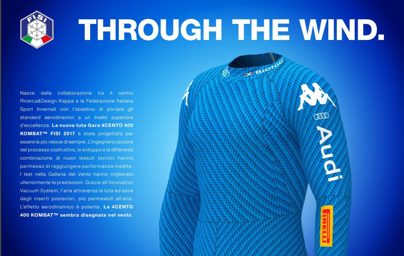 Nasce dalla collaborazione tra il centro Ricerca&Design Kappa e la Federazione Italiana Sport Invernali con l’obiettivo di portare gli standard aerodinamici a un livello superiore d’eccellenza. La nuova tuta Gara 4CENTO 400 KOMBAT™ FISI 2017 è stata progettata per essere la più veloce di sempre. L’ingegnerizzazione del processo costruttivo, lo sviluppo e la differente combinazione di nuovi tessuti tecnici hanno permesso d i raggiungere performance inedite. I test nella Galleria del Vento hanno migliorato ulteriormente le prestazioni. Grazie all’innovativo Vacuum System, l’aria attraversa la tuta ed esce dagli inserti posteriori, più permeabili all’aria. L’effetto aerodinamico è potente. La 4CENTO 400 KOMBAT™ sembra disegnata nel vento. Dettagli: - Logo Omini in stampa sublimatica- Etichetta taglia personalizzata con il nome dell’atleta - Tessuto tecnico sviluppato dal Centro Ricerca&Sviluppo Kappa, con grafica ispirata alla fibra di carbonio - Tagli ergonomici per migliorare la vestibilità - Etichetta tecnologia - Polsino elasticizzato - Lettering e bandiera Italia in stampa sublimatica - Banda di silicone interna per migliorare l’aderenza con lo scarpone - Inserti con grafica ispirata ai bocchettoni d’aria.