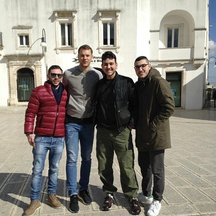 Il portiere del Bayern Monaco e della Germania campione del mondo Manuel Neuer è stato avvistato a Martina Franca. Dopo l'impegno di Champions contro l'Arsenal e il pareggio in campionato contro l'Hertha, il numero 1 tedesco ha scelto la splendida cittadina pugliese per un po' di relax, tra l'incredulità degli abitanti. "Lo abbiamo visto vicino la Chiesa di Sant'Antonio", segnalavano alcuni abitanti. "Non scherziamo...", sembravano più scettici altri come riportato da martinasera.com. Poi sul web le prime foto e tutti i dubbi dissipati.