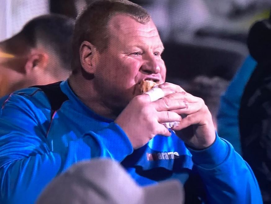 Minuto 82 della sfida di FA Cup tra il Sutton, club di 5a divisione inglese, e l'Arsenal. Il portiere di riserva e preparatore, Wayne Shaw, 45 anni e oltre 100 kg di peso, una volta capito che non sarebbe più entrato in campo, decide di tappare il buco nello stomaco mangiando una meat pie (torta di carne) ripresa dalle telecamere. Un gesto diventato subito virale...