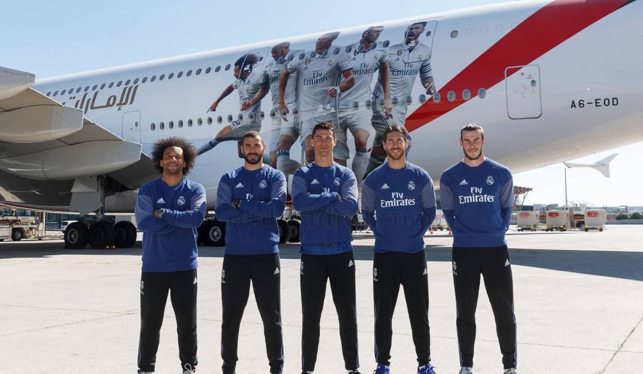 Cristiano Ronaldo, Sergio Ramos, Marcelo, Bale e Benzema sono stati i testimonial della presentazione del nuovo aereo del Real Madrid, un A380 della compagnia di Dubai Emirates. Sul velivolo, che ha fatto il suo debutto all'aeroporto Adolfo Suárez Madrid-Barajas, le foto dei cinque campioni del club campione d'Europa.