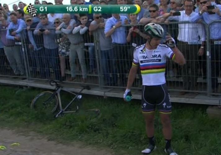 Brutta caduta per Peter Sagan al Giro delle Fiandre 2017. Il campione del mondo, che era all'inseguimento di Gilbert ai -15 km dall'arrivo, ha sbattuto contro un tifoso ed è finito a terra abbandonando i sogni di vittoria. Coinvolti anche Van Avermaet e Neasen che non hanno potuto evitare lo slovacco.