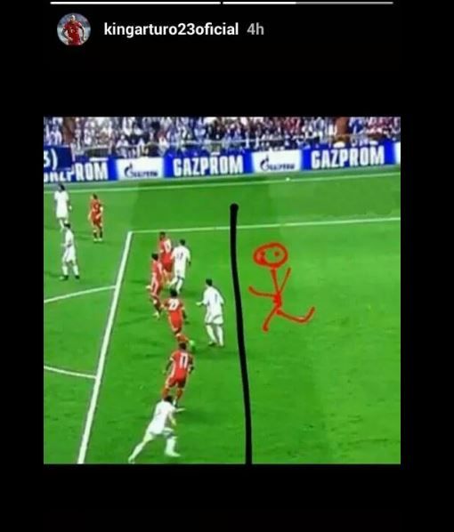 Dopo l'eliminazione del Bayern dalla Champions League, su Twitter i tifosi si sono divertiti a giocare con le immagini per sottolineare l'arbitraggio a favore del Real. Ironia e rabbia. Ma contro la direzione di gara non si sono espressi solo supporter e spettatori, ma anche Arturo Vidal, che su Instagram ha voluto spiegare a tutti perché il gol di CR7 era "regolare", disegnando a mano un omino rosso oltre la linea dell'offside. In un altra "story" su Instagram, il cileno ha tracciato una linea gialla storta per dimostrare come il portoghese fosse in gioco.