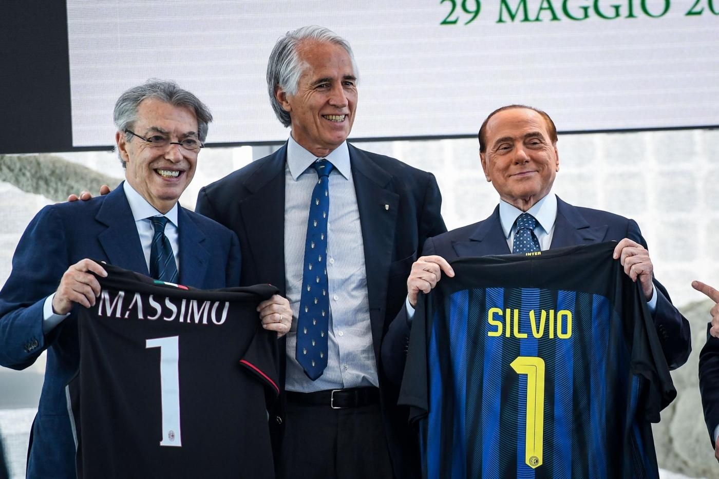 Berlusconi con la maglia dell'Inter, Moratti con quella del Milan