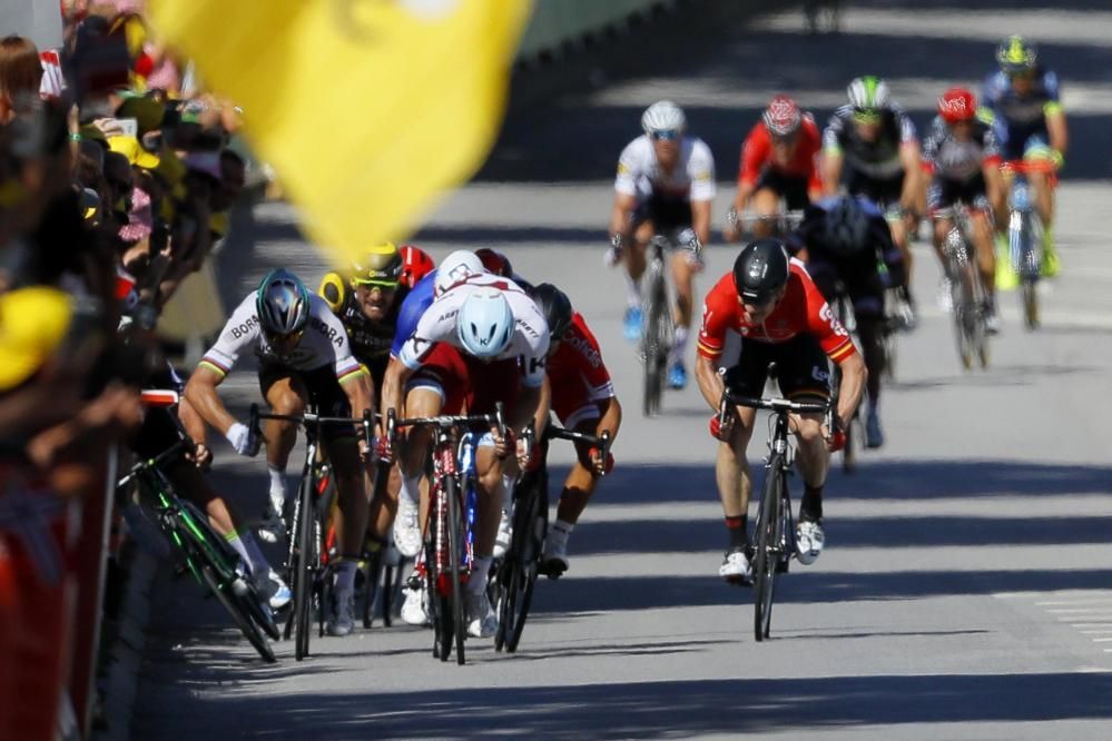 Brutta caduta in volata negli ultimi metri della quarta tappa del Tour de France. Sagan ha allargato il braccio e Cavendish è finito contro le transenne cadendo rovinosamente. La giuria ha deciso di squalificare dalla corsa il campione del mondo.