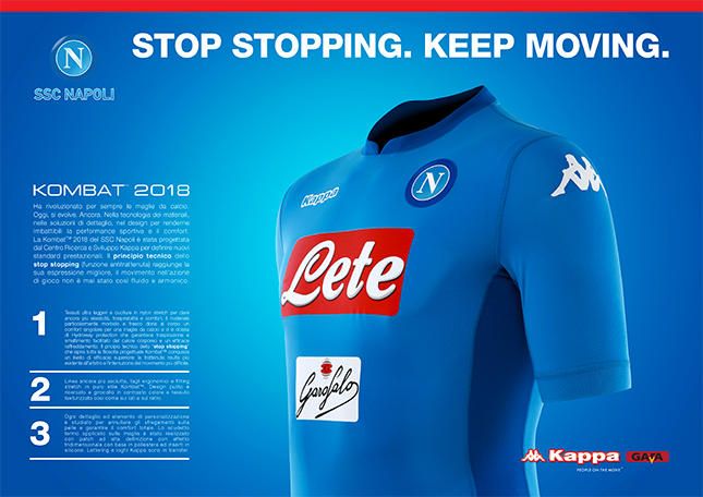 Il Napoli ha presentato la nuova maglia "home" della serie "Kombat" progettata dal Centro Ricerca e Sviluppo Kappa per definire nuovi standard prestazionali. Il principio tecnico dello stop stopping (funzione antitrattenuta) raggiunge la sua espressione migliore, il movimento nell’azione di gioco non è mai stato così fluido e armonico. Tessuti ultra leggeri e cuciture in nylon stretch per dare ancora più elasticità, traspirabilità e comfort. Il materiale particolarmente morbido e fresco dona al corpo un comfort singolare per una maglia da calcio e d è dotata di Hidroway protection che garantisce traspirazione e smaltimento facilitato del calore corporeo e un efficace raffreddamento. Il principio tecnico dello “stop stopping” che ispira tutta la filosofia progettuale Kombat conquista un livello di efficacia superiore: la trattenuta risulta più evidente all’arbitro e l’interruzione del movimento più difficile. Linea ancora più asciutta, tagli ergonomici e fitting stretch in puro stile Kombat. Design pulito e ricercato e girocollo in contrasto colore e tessuto texturizzato così come sui lati e sul retro. Ogni dettaglio ed elemento di personalizzazione è studiato per annullare gli sfregamenti sulla pelle e garantire il comfort totale. Lo scudetto termo applicato sulla maglia è stato realizzato co patch ad alta definizione con effetto tridimensionale con base in microfibra ed inserti in silicone. Lettering e loghi Kappa sono in transfer ad alta densità.
