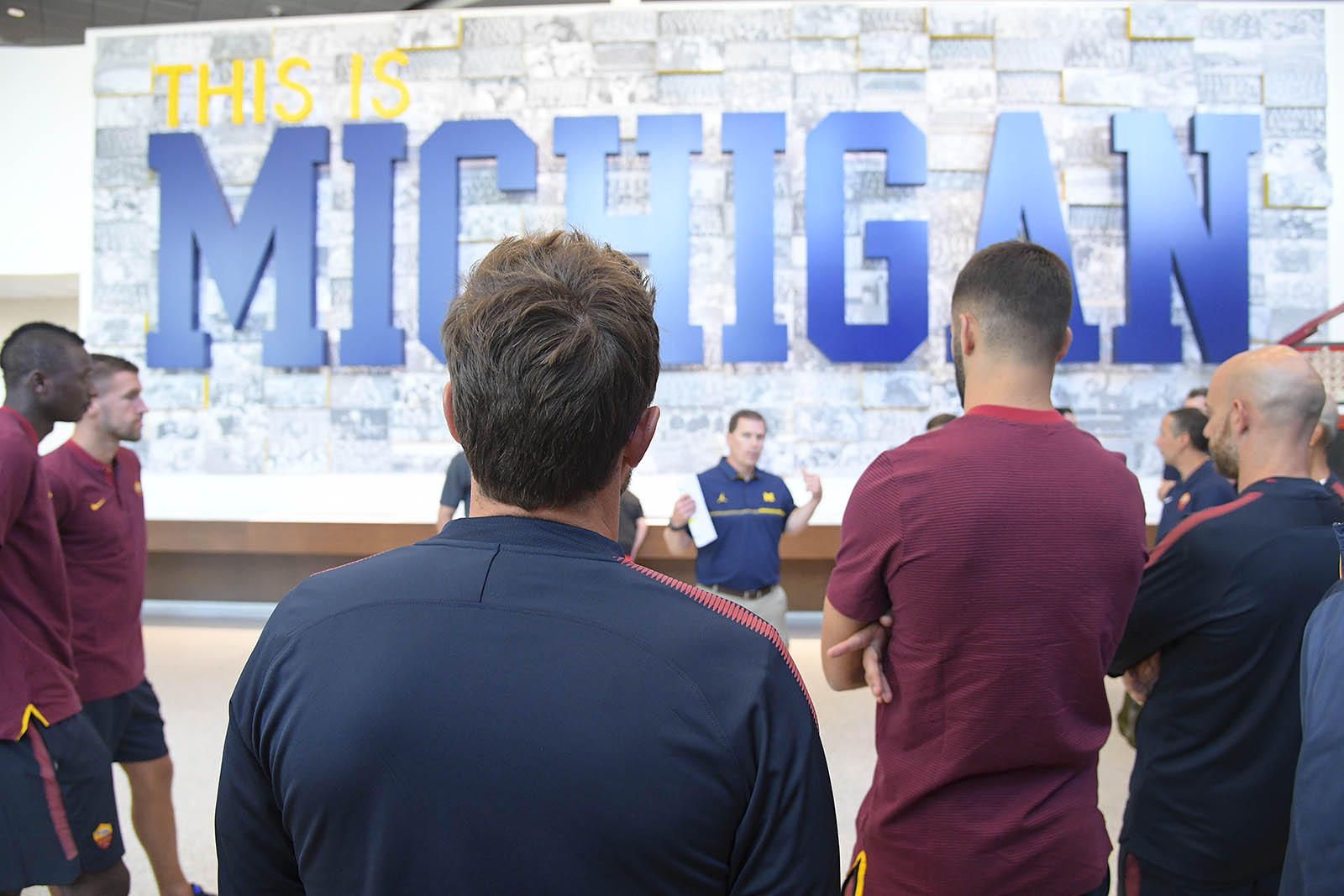 Kevin Strootman, Maxime Gonalons e Sadiq Umar sono stati ospiti nelle strutture della squadra di Football della Michigan University. Accompagnati da Eusebio Di Francesco e dall’amministratore delegato Umberto Gandini, i calciatori giallorossi sono stati accolti dal coach Jim Harbaugh e dai suoi Wolverines e si sono cimentati in alcune prove, sia calcistiche sia con la palla ovale.