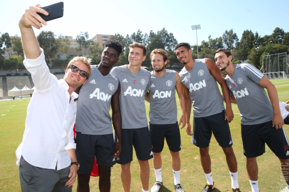 Il campione del mondo di Formula 1, Nico Rosberg, ha fatto visita al Manchester United: l'ex pilota tedesco ha raggiunto i Red Devils nel ritiro di Los Angeles: maglia personalizzata, tanto sorrisi e gli immancabili selfie.