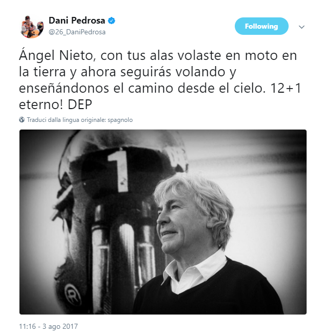 Motogp 1 di 20 2 di 20 3 di 20 4 di 20 5 di 20 6 di 20 7 di 20 8 di 20 9 di 20 10 di 20 11 di 20 12 di 20 13 di 20 14 di 20 15 di 20 16 di 20 17 di 20 18 di 20 19 di 20 20 di 20 Il ricordo di Nieto 1 di 20 2 di 20 3 di 20 4 di 20 5 di 20 6 di 20 7 di 20 8 di 20 9 di 20 10 di 20 11 di 20 12 di 20 13 di 20 14 di 20 15 di 20 16 di 20 17 di 20 18 di 20 19 di 20 20 di 20 Avvia slideshow Il ricordo di Nieto Una marea di messaggi social per la leggenda scomparsa: da Marquez a Capirossi, da Antonio Banderas a Fernando Alonso, piloti e sportivi ricordano il 13 volte campione del mondo. 04 ago 2017 - 11:55 20 foto MotoGP social messaggi Nieto Ultimi video Moto3: spaventoso incidente tra Rueda e Dettwiler Il team Gresini si veste di blu per il GP di Malesia Agostini: "Marquez e Rossi? Sono sullo stesso livello" Ecco il drone che sfida la MotoGP a Misano La sfida Bagnaia-Marquez infiamma anche MotoGP 25 Buon compleanno dottor Rossi Spavento per Jorge Martin: brutta caduta durante i test con l'Aprilia Martin: "Voglio portare l'Aprilia a vincere" Bezzecchi: "Voglio fare dei bei risultati" A tu per tu con Marc Márquez Bagnaia non si nasconde: "Punto a vincere il Mondiale" Marquez allontana la pressione: "Bagnaia è il favorito" Dall'Igna carico: "Avere due campioni è un vantaggio" Martin: "Fantastico avere il numero 1, è stato facile decidere di portarlo" Bezzecchi: "Da Martin posso imparare tutto" I più visti di Motogp Audi consegna a Marc e Alex Marquez due RS6 personalizzate Dalla AJS di Graham, alla Yamaha di Rossi: il meglio delle moto da corsa nel museo della Fim Dainese, il kit Soleluna Vale46 anniversario all'asta per Unicef MotoGP, le immagini del sabato di qualifiche e Sprint al Mugello Aleix Espargarò operato al braccio destro: "Ma sono pronto per correre" Bagnaia lancia la sua prima collezione digitale insieme a VR46 Metaverse e ItaliaNFT Marquez, ultima chiamata per il titolo: "Sarà dura, ho pensato al ritiro" Bastianini travolto da Marini: scapola rotta | "Tornerò più forte" Bastianini travolto da Marini: scapola rotta | "Tornerò più forte"