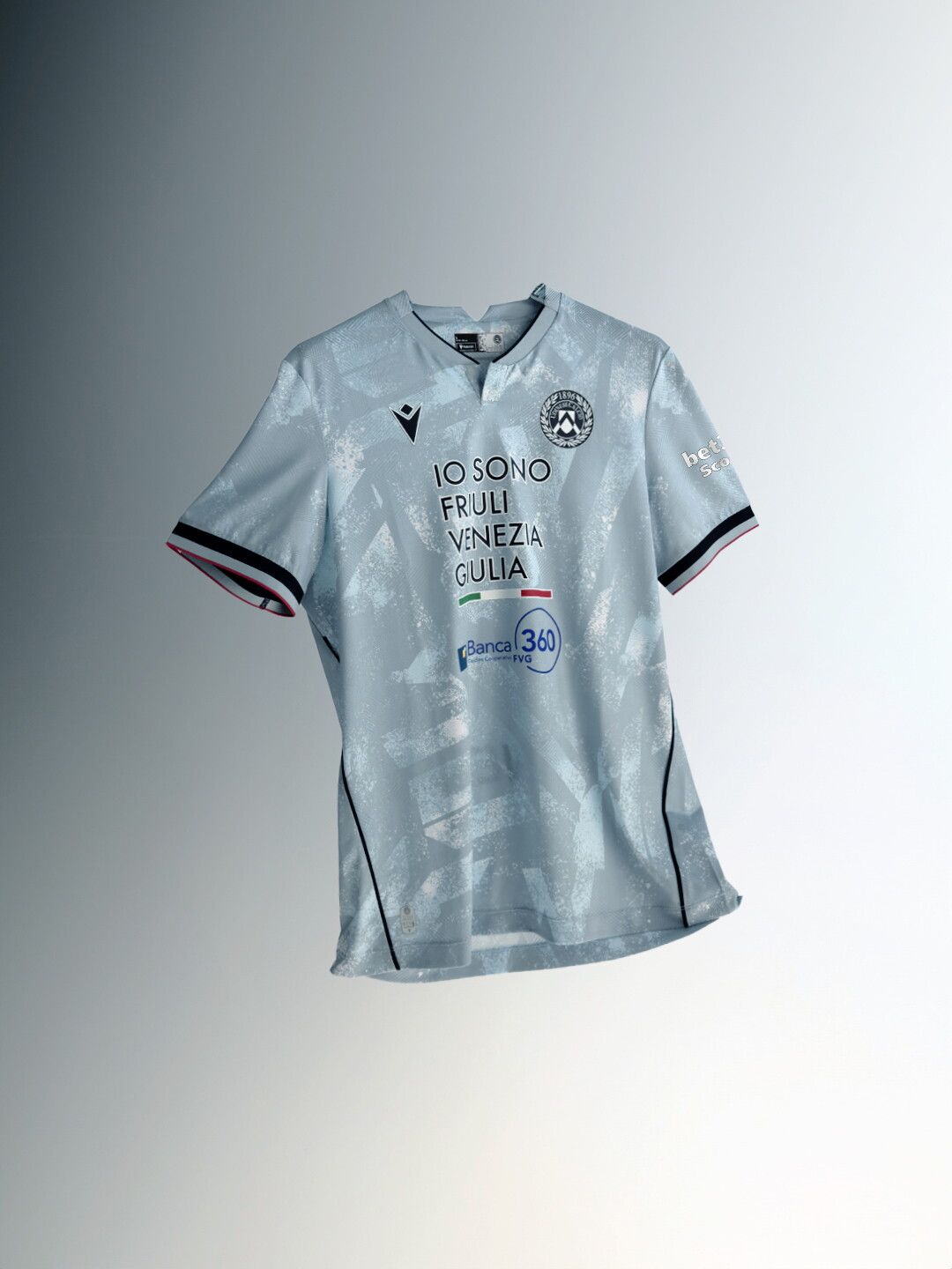 Grafica astratta, design elegante ed esclusivo per la nuova maglia ‘Away’ 2025/26 dell'Udinese, presentata nel corso di un evento organizzato in partnership con la Regione Friuli-Venezia Giulia e PromoTurismoFVG in una cornice d’eccezione, in un casone, edificio caratteristico nel cuore della laguna di Marano Lagunare. È realizzata in tessuto Eco Fabric, proveniente al 100% da plastica riciclata.La seconda maglia dell’Udinese, firmata Macron, si distingue per il collo alla coreana, impreziosito da dettagli in blu navy e rosso che richiamano i bordi manica. Il colore principale è un elegante blu avio chiaro, arricchito da una grafica sublimata astratta: un motivo composto da figure geometriche irregolari e sfumate in bianco e azzurro, che si estende sia sul fronte sia sul retro della maglia e si ispira allo stile delle maglie anni ’90. Come per la divisa Home, il backneck è personalizzato con un’etichetta bianconera su sfondo geometrico, il logo dell’Udinese, la scritta I PRIMI BIANCONERI D’ITALIA, il logo Macron e la dicitura Designed in Bologna: un dettaglio che racconta l’origine e la cura con cui ogni capo viene ideato e sviluppato nel Macron Campus, quartier generale del brand emiliano. Sul petto risaltano in primo piano il marchio “Io sono Friuli Venezia Giulia”, in blu navy il Macron Hero e lo stemma dell’Udinese Calcio. Nel retrocollo esterno trova spazio un omaggio alla storia del club: lo storico logo con la Zebretta degli anni ’70 e ’80, racchiuso in una cornice azzurra.