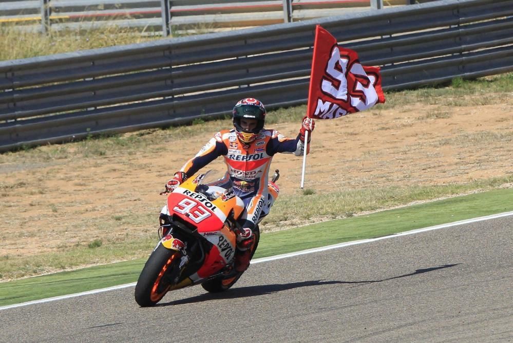 Marc Marquez vince il GP di Aragon e conquista la sua quinta vittoria stagionale in MotoGP. Il pilota Honda trionfa in casa, chiudendo davanti all'altra HRC di Pedrosa e alla Ducati di un ottimo Lorenzo, per un podio tutto spagnolo. Quinto un comunque eroico Valentino Rossi, dietro al compagno di team Vinales. Gara da dimenticare invece per Dovizioso, che chiude 7° consegnando a Marquez la leadership solitaria del mondiale con 16 punti di vantaggio.