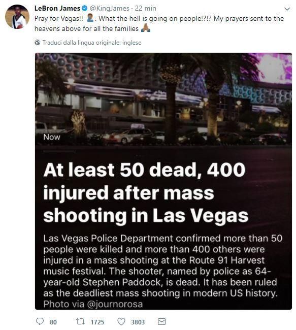 Anche il mondo dello sport si stringe attorno a Las Vegas, la città del Nevada teatro della peggior strage da armi da fuoco della storia americana. Almeno 50 persone sono morte e 400 sono rimaste ferite in una sparatoria nei pressi del Mandalay Bay Casino, a Las Vegas. L'autore degli spari, il 64enne Stephen Paddock, si è ucciso prima di essere catturato dalla polizia. Da LeBron James a Chris Paul, le stelle dello sport mondiale si uniscono al cordoglio a vittime e familiari.